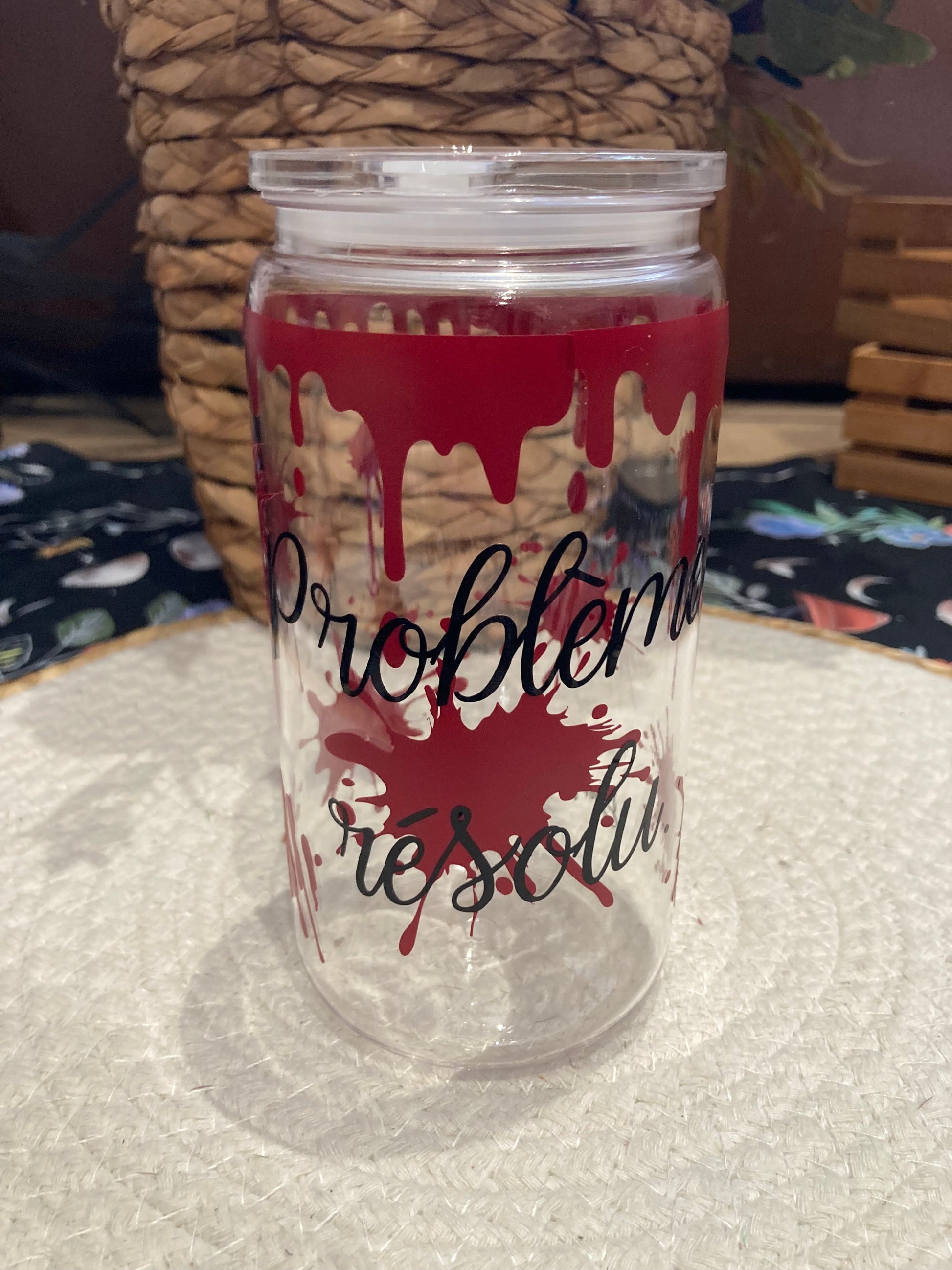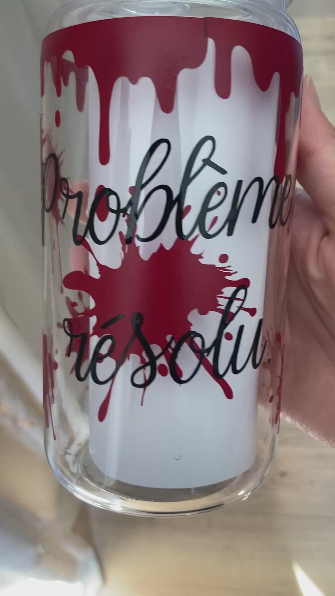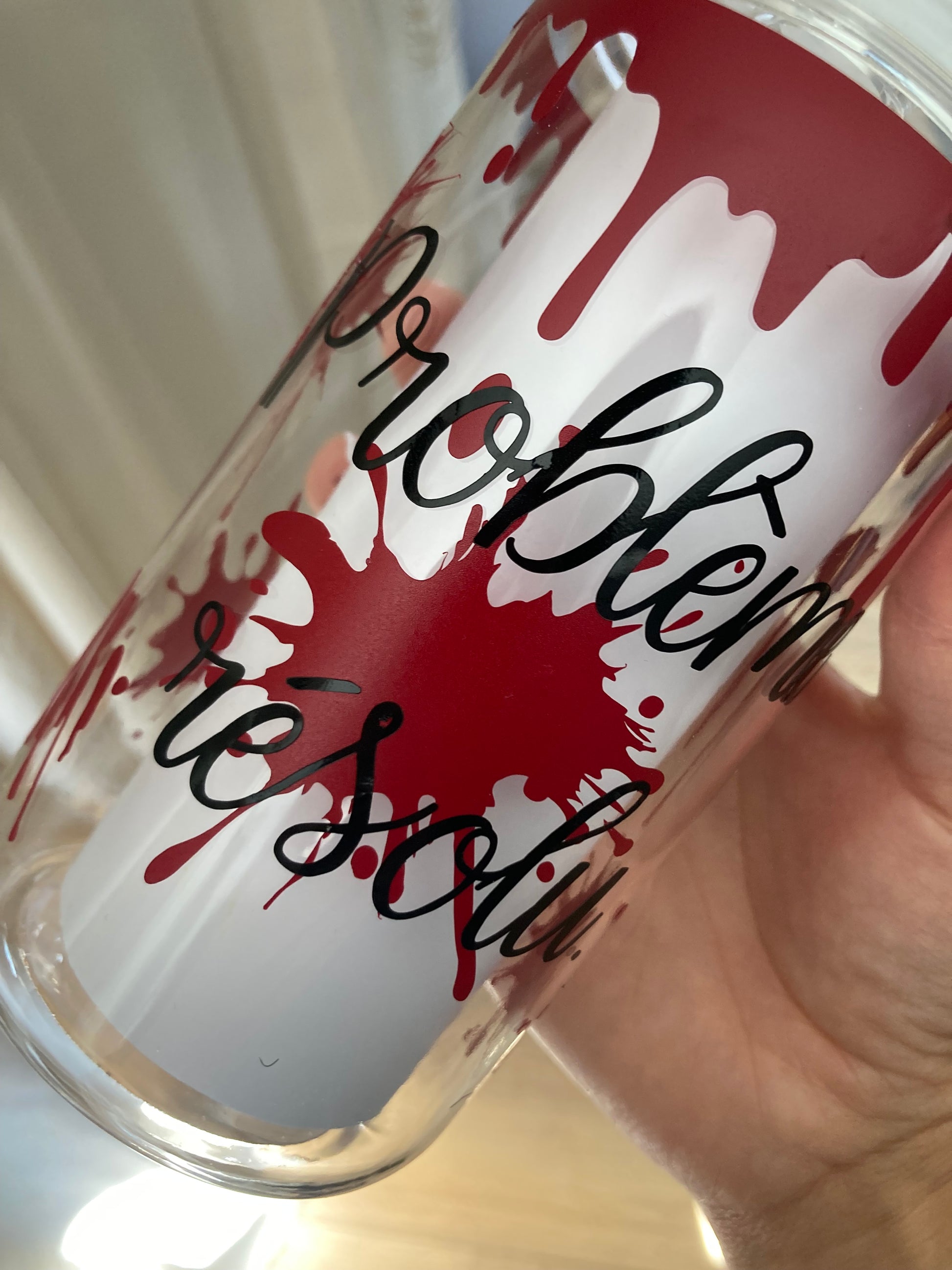 Préparez-vous à une immersion totale dans l'horreur avec la gourde transparente "Problème Résolu" éclaboussée d'un réalisme saisissant de taches de sang.